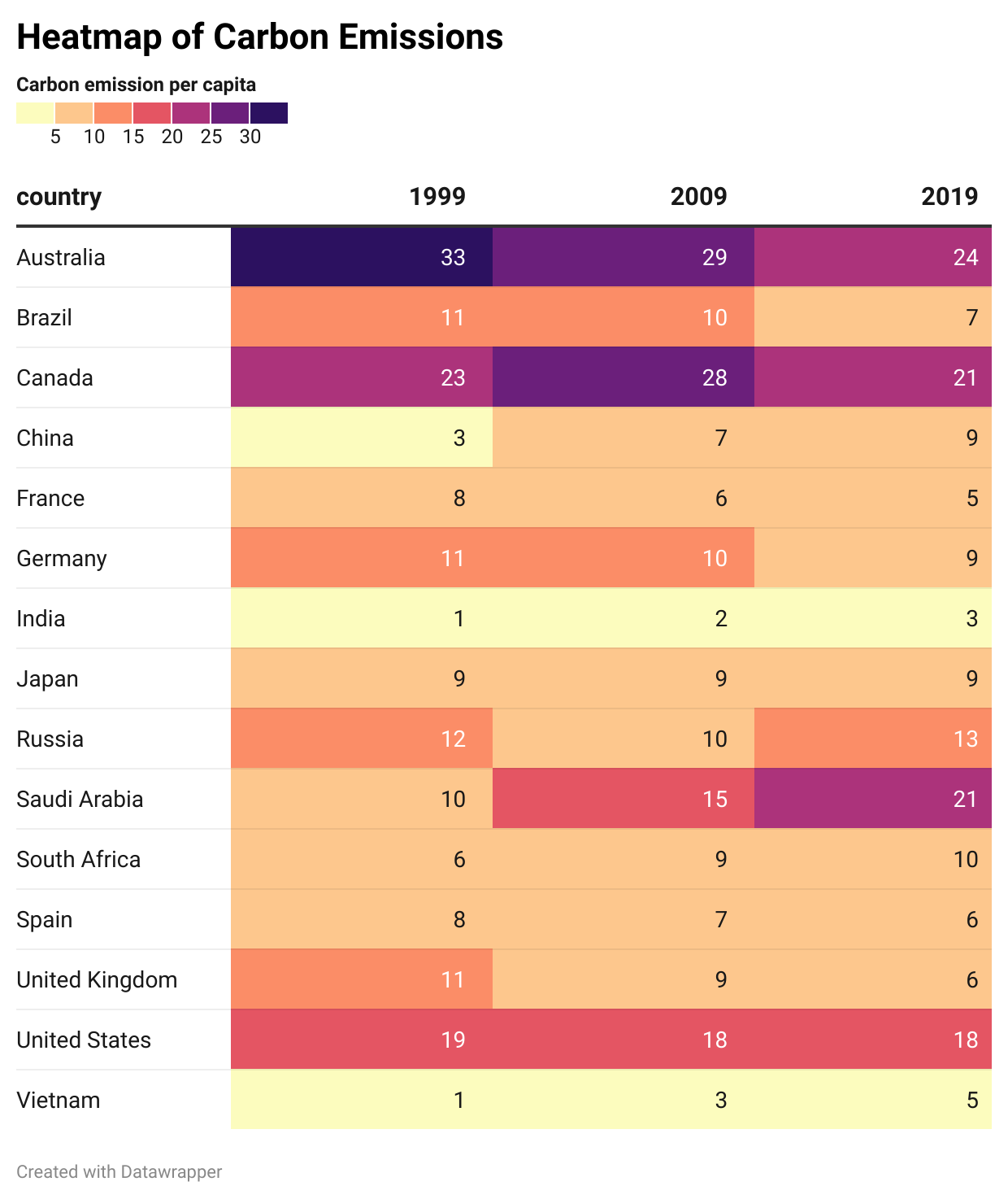 This is really just a chart with the data color-coded. I have kept the numbers here but usually, these charts hide the numbers to avoid clutter. They are useful for looking at trends over long time periods across a lot of categories.