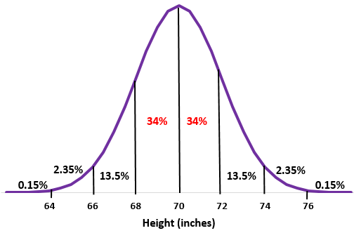 This chart is read by calculating the area under the curve. This is true for all probability charts. The above chart shows the distribution of height. The sum of this distribution, which is the area under the chart, is always 100%. If you look at the left extreme, only 0.15% of the population has a height shorter than 64 inches. The median (middle) height is 70 inches. 50% of the population (34%+13.5%+2.35%+0.15%) has height more than this. Similarly 2.5% (2.35% + 0.15%) of the population has height more than 74 inches. More on this and its implications in the coming weeks.