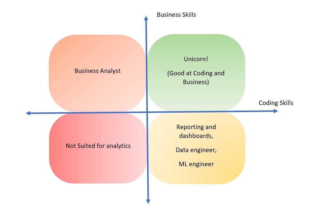 There is no data involved in these charts. They show ideas by using the axis system. The 4 segments represent areas where the two axes are either high-high, high-low, low-high, or low-low. These are very powerful for getting ideas across. For example - the box highlighted red stands for candidates with low coding and low business skills. So this area is marked ‘not suited for analytics’.